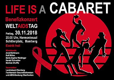 „What good is sitting alone in your room? Come hear the music play …“ Was Liza Minelly in Bob Fosses legendärem Film „Cabaret“ singt, gilt am 30. November 2018 auch für hiesige Musicalfreunde: Sie sollten nicht alleine zuhause hocken, sondern um 20 Uhr in den Spiegelsaal der Harmonie kommen. Unter dem Motto „Life is a Cabaret“ findet dort das diesjährige Benefizkonzert zum Welt-Aids-Tag statt. Das Programm hat als künstlerischer Leiter unser Mitglied Harald Schneider zusammengestellt hat, der als Begleiter am Flügel auch selber mitwirkt. Neben Liza-Minelli-Songs, die Marie-Sophie Weidinger interpretiert, Liedern und Texten von und mit Arnd Rühlmann und Rolf Böhm, dürfen Sie sich auf Soul, Funk, Rock & Jazz aus Bamberg freuen – mit der Gruppe Monkee Shuffle und unserem Stipendiaten Justus Böhm am E-Bass. Für letztere wird dann auch eigens eine Tanzfläche freigeschaufelt. Veranstalter des Konzerts sind auch in diesem Jahr der Fachbereich Gesundheitswesen am Landratsamt Bamberg und die Aids Beratung Oberfranken, Außenstelle Bamberg. Der Eintritt ist frei, die erbetenen Spenden werden dem Anam Cara Network e.V. zur Verfügung gestellt, das sich um Aids-Waisenkinder in Tansania kümmert. Alle am Konzert beteiligten Künstler verzichten zugunsten des Projekts auf ihre Gage.
