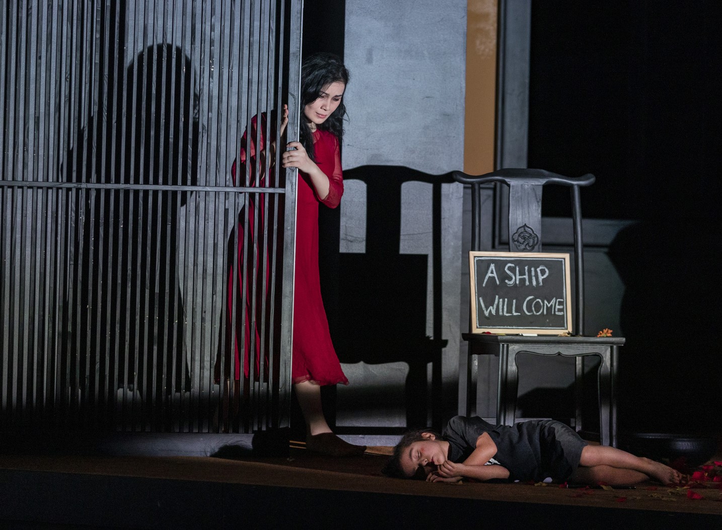 Und dann ist da noch das Kind, selbstredend eine Tochter, die biologisch wundersam schon am Ende des ersten Akts auftaucht und später für die bevorstehende Rückkehr des Vaters in einen Kimono gehüllt und mit Kusslippen bemalt wird wie weiland ihre Mutter. Nichts gegen Kinderstatisten! Die kleinkindhafte siebenjährige Jana Beck ist sogar in der Lage, den legendären Summchor lang die sonst fast leere Bühne zu füllen, wird aber letztlich dafür missbraucht, dass der Regisseurin nichts Besseres eingefallen ist, als den Missbrauch Cio-Cio-Sans auch auf deren Kind zu projizieren.