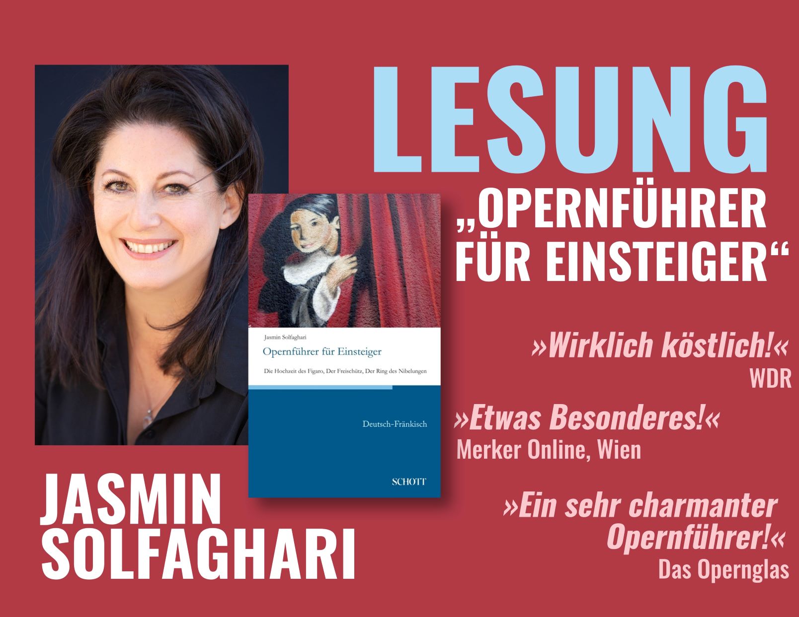 Jasmin Solfaghari, die Autorin des hochgelobten Opernführers für Einsteiger, dessen fränkische Version der Bamberger David Saam auf ganz unvergleichliche Weise verfasst hat, kommt nach Bamberg.