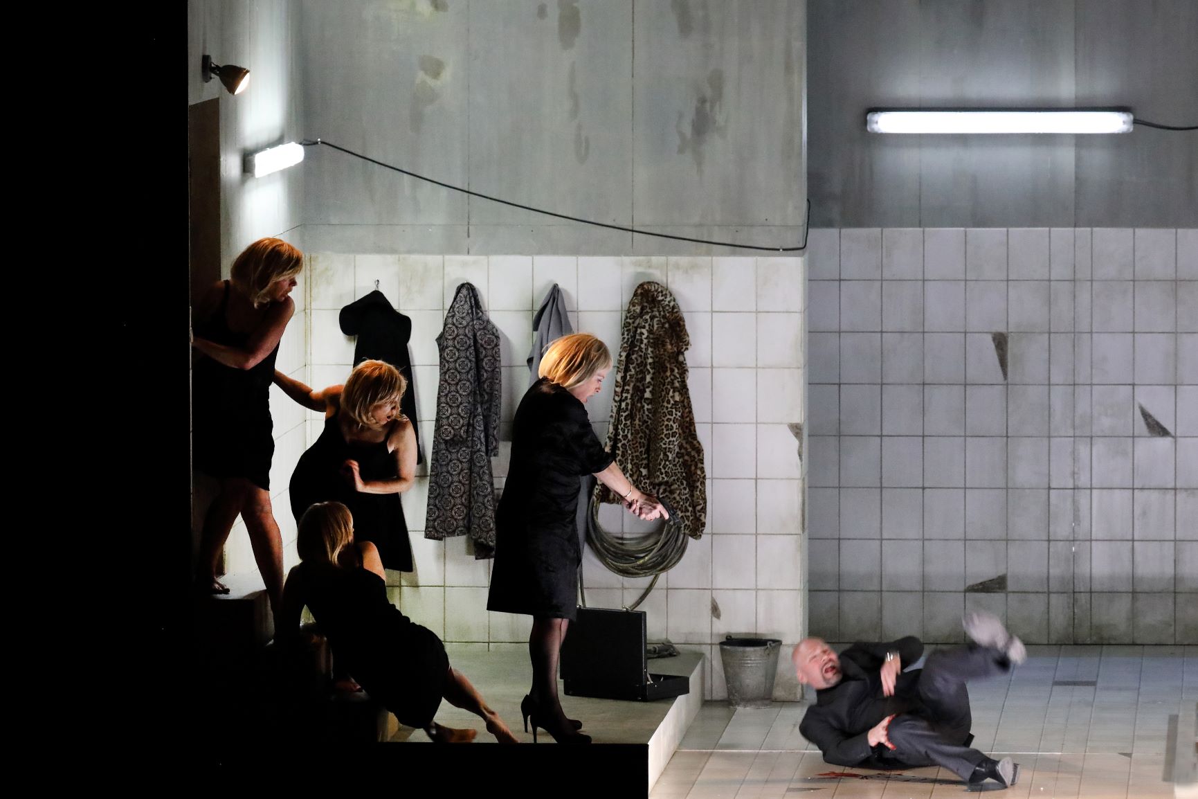 Dass Judith immer wieder, wie es im Libretto steht, Blaubart von Liebe singt, ist in diesem Setting natürlich eine Lüge. Hier ist sie kein schicksalsergebenes Opfer, sondern von vornherein und berufsbedingt eine neugierige und mutige Frau, die das Heft der Handlung an sich gerissen hat. Am Ende, wenn sie die drei Frauen befreit hat und wie das Urbild der „Fidelio“-Leonore zur Waffe greift, bricht nicht für sie die immer bleibende Nacht an, sondern für ihn. John Lundgren, der im neuen Bayreuther „Ring“ als Alberich zu erleben sein wird, ist ein Blaubart der Spitzenklasse gerade weil er eher zurückhaltend und nicht dämonisch erscheint – ein glatzköpfiger Perverser im erstklassigen Anzug überm Rolli (Kostüme: Sussie Juhlin-Wallén), dem Nina Stemme in falschem Leopardenmantel und Blondperücke vor allem kühle Entschlossenheit entgegenbringt. Beide sind sängerdarstellerisch in Topform und verkörpern auf ideale Weise, was die Regisseurin zeigen will – bis hin zur filmischen Großaufnahme der eben nicht mehr jugendfrischen Augenpartie der 56-jährigen Sängerin. Letzteres ist mitnichten abträglich, sondern unterstreicht die entschieden feministische Sicht, die alle mittragen.