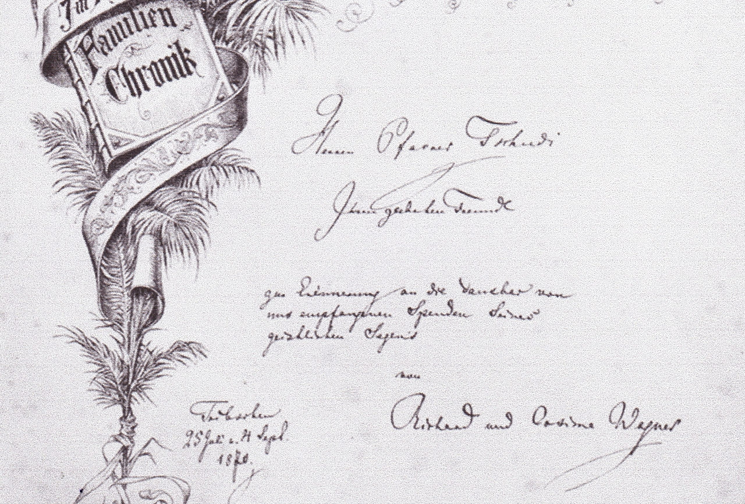 Ob da in Tribschen zumindest kurzzeitig der Haussegen schief hing? Schließlich hat Richard Wagner, wie man in der obigen Abbildung erkennen kann, seinen gewiss auch von ihm lang ersehnten Hochzeitstag mit Cosima schlichtweg falsch datiert. Geheiratet wurde nämlich nicht am 25. Juli, sondern erst am 25. August 1870. In der reformierten Matthäuskirche von Luzern fungierten als Trauzeugen Hans Richter und Malwida von Meysenbug. Der Termin war kein Zufall, feierte doch am selben Tag König Ludwig II., der wichtigste Mäzen Wagners und der künftigen Festspiele, seinen 25. Geburtstag. Und das Ereignis vom 4. September, das übrigens direkt in Tribschen stattfand, war endlich – fast fünfzehn Monate nach seiner Geburt – die Taufe von Siegfried Wagner.