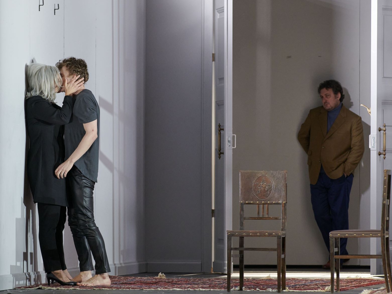 Das Geschehen läuft als Rückschau des gealterten Titelhelden (Tenor Jonas Kaufmann) ab, der sein jugendliches Alter Ego (Schauspieler Nikolay Sidorenko) empathisch bei dessen Abenteuern begleitet. Das funktioniert, wenn man sich daran gewöhnt hat, überraschend gut, bleibt aber insofern unbefriedigend, als sich in den Interaktionen der beiden Parsifal-Figuren nicht immer Logik erkennen lässt. Leider bleibt es nicht bei der Verdoppelung der Titelfigur. Auch Parsifals Mutter Herzeleide bekommt einen Auftritt, und zwar gleich in dreifacher Form.