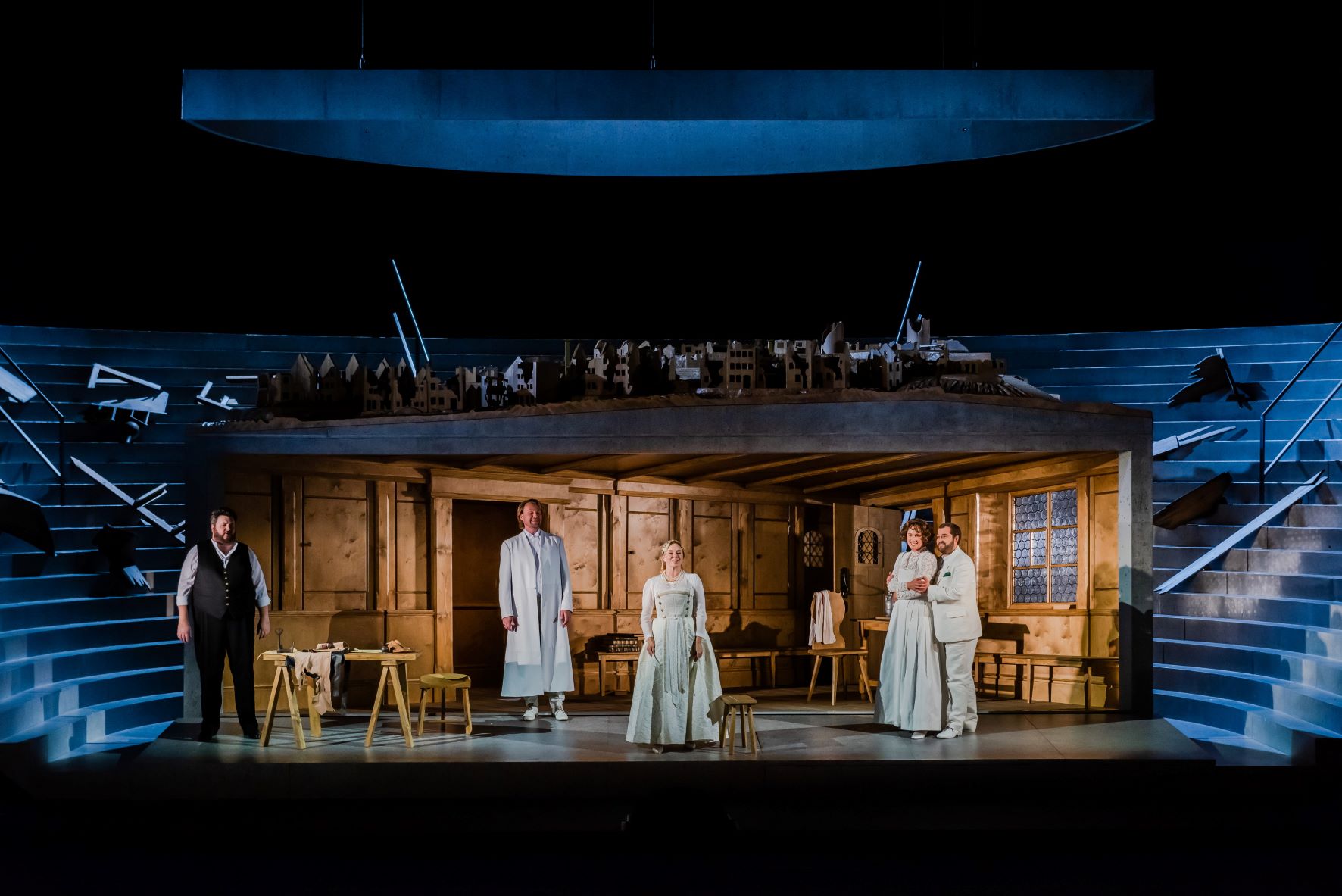 Im dritten Aufzug wird es zunächst heimelig. Auf der Bühne eine riesige Schusterstube, ganz aus Holz, mit Butzenfenster, auf dem Dach eine noch kleinere Miniaturausgabe von Nürnberg, das jetzt nur noch eine Art Modell ist. Pountney lässt in seiner Personenregie keinen Zweifel daran, dass Sachs Eva liebt, und auch Eva liebt ihren Sachs. Doch dieses Glück hat keine Zukunft, nicht umsonst hat Wagner hier sein Zitat aus „Tristan und Isolde“ eingebaut, wenn Hans Sachs singt: „Mein Kind, von Tristan und Isolde kenn ich ein traurig Stück. Hans Sachs war klug und wollte nichts von Herrn Markes Glück.“ Sachs umarmt Evchen inniglich, um sie dann in Stolzings Arme zu führen. Das ist vielleicht der berührendste Moment der Aufführung, großartig gespielt.