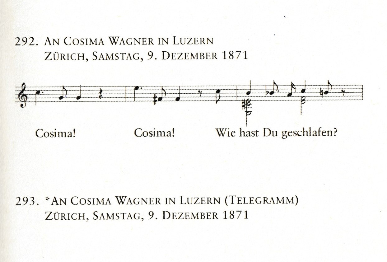 [2] Siehe Abbildung. Den kleinen Morgengruß notierte Wagner vermutlich auf der Fahrt nach Zürich und gab ihn dort gleich zur Post, die damals, wie man weiß, schneller war als heutige. Das Telegramm Nr. 293 ist nicht erhalten.
