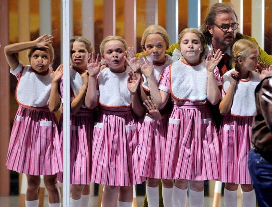 Die dritte Szene offenbart die größte Text-/Bildschere: Da Kinder das Gold sein sollen, ist Nibelheim ein Kinderhort mit pastellfarbenen Lamellen an den Fenstern. Hier treffen Wotan und Loge, die nach Alberichs „Ring“ gieren, auf die beiden Nibelungen, den entführten Jungen, der gerne alle und alles traktiert, sowie acht brav gekleidete Mädchen, die Männerköpfe mit Flügelhelm malen, also künftige Walküren sein könnten. Warum sind es nicht neun? Wurde falsch gezählt?
