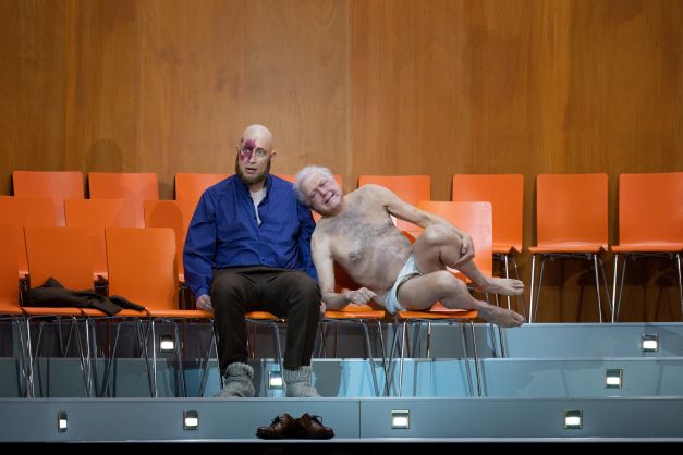 In der ersten „Rheingold“-Szene muss dieser Alberich glaubhaft sein, obwohl im Stress-Labor des weitläufigen und mehrstöckigen „E.S.C.H.E.“-Forschungszentrums (Experimental Scientific Center for Human Evolution) er als einziger mit seiner Spezialbrille die Assistenzärztinnen als verführerische Rheintöchter wahrnimmt. Später, im eigenen Nibelungenlabor, agiert er umso rabiater, weil es den titelgebenden Ring und den Verwandlungszauber per Tarnhelm ja gar nicht gibt. Sondern nur einen roten EEG-Helm zu Forschungszwecken. Wie entschieden Kränzle in „Siegfried“ als gealterter Schwarzalbe mit der Gehhilfe durch die schier endlos sich aneinanderreihenden Flure und Räume dieser merkwürdigen Versuchsanstalt streift, zeigt an, dass Alberich schon aus Altersgründen zwar längst nicht mehr der ist, der er mal war, aber sich noch lange nicht geschlagen gibt. Ach, die alten weißen Männner! Seine Greisendarstellung in der „Götterdämmerung“ dann ist umwerfend. Da stakst ein fast nackter Alter so klapprig auf der Bühne herum, dass er sich jeden Moment den Oberschenkelhals brechen könnte und wirkt doch wie aus einem antiken Drama. Und er singt in einer Wortverständlichkeit, die ihresgleichen sucht, wagt Sprechgesang an Stellen, die man so vielleicht noch nicht gehört hat. Schade, dass Dmitri Tcherniakov den für mich nicht nachvollziehbaren Einfall hatte, Alberich in seiner zentralen Szene mit Hagen im 2. Akt auch noch stricken zu lassen. Warum? Das braucht ein Kränzle doch nicht! Der kriegt es auch ohne zwanghafte Beschäftigung hin, einen vollen Saal in Bann zu schlagen, wie er es beispielhaft unter anderem als Gunther im Frankfurter „Ring“ zur Trauermusik und als Beckmesser in den Bayreuther „Meistersingern“ vorgeführt hat.