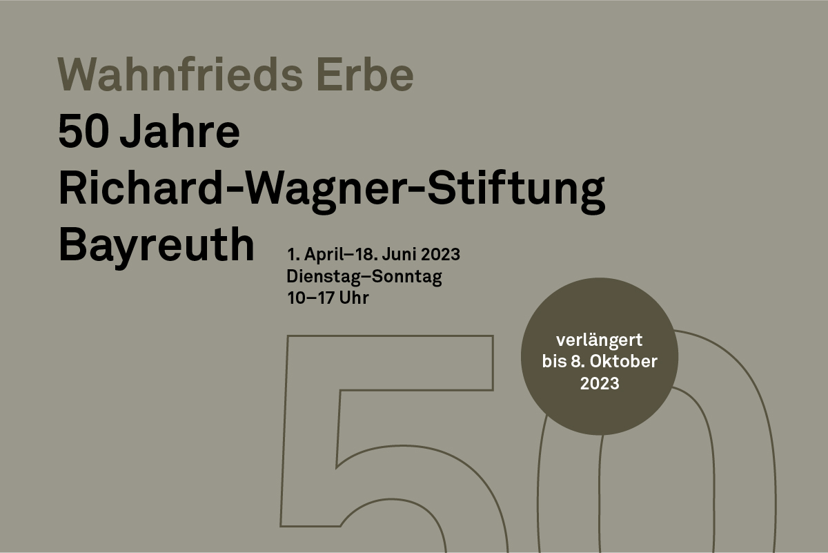 Aufgrund der öffentlichen Resonanz und des großen Interesses an der aktuell laufenden Sonderausstellung „Wahnfrieds Erbe – 50 Jahre Richard-Wagner-Stiftung Bayreuth“ wird diese noch ergänzt und erweitert sowie bis zum 8. Oktober 2023 verlängert. So sollen vor allem auch die Besucher der diesjährigen Bayreuther Festspiele die Möglichkeit erhalten, sich ein Bild von Struktur, Aufgabe und Leistung der Stiftung zu machen und insbesondere auch herausragende Exponate aus der Sammlung des Museums zu sehen bekommen, die ansonsten öffentlich nicht oder nur sehr selten präsentiert werden. Die Verlängerung trägt außerdem den Erfordernissen von Nachhaltigkeit und der verfügbaren finanziellen wie personellen Ressourcen Rechnung. Die ursprünglich für den Sommer vorgesehene Ausstellung „Mensch Wagner“ wird auf den Sommer 2024 verschoben. Für den Umbau wird die Ausstellung ab 10. Juli für eine Woche lang geschlossen und ab 17. Juli wieder für Besucher zugänglich sein.