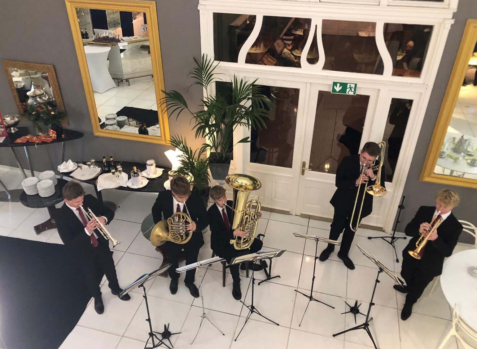 Das Quintett der „Metallophoniker“ hieß mit einem jazzigen, schwungvollen Intro willkommen und setzte den musikalischen Ton für die festliche Zusammenkunft. Die jungen Musiker – Johannes Lang (Trompete), Jakob Stratmann (Trompete), Paul Roux (Horn), Max Klingenspohr (Posaune) und Hannes Holhut (Tuba) – zählen zu den besten Nachwuchstalenten der Kreismusikschule Bamberg und repräsentieren die nächste Generation potenzieller Stipendiaten unseres Verbands.