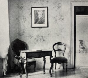 Hier, in sei­nem Ar­beits­zim­mer, ver­schied am frü­hen Nach­mit­tag des 13. Fe­bru­ar 1883 Ri­chard Wag­ner. Das Foto zeigt ei­nen Zu­stand des Rau­mes vor 1951 – Vor­la­ge: Karl Ip­ser, Ri­chard Wag­ner in Ita­li­en, Salzburg